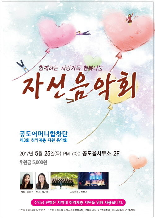 공도어머니합창단(단장 이정숙)은 다가오는 5월 25일(목) 오후 7시 공도읍사무소 2층 대강당에서 제 3회 취약계층 지원 자선 음악회를 개최한다.