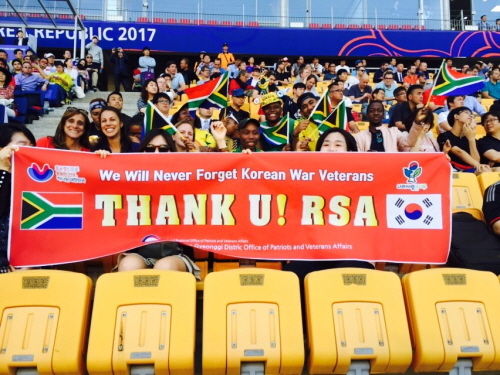 경기남부보훈지청(지청장 남창수)은 5.21(일) 수원월드컵 경기장에서 열린 「FIFA U-20 World Cup Korea republic 2017」남아프리카공화국 vs 일본 경기에서 6.25전쟁 참전 국가인 남아프리카공화국에 대한 감사의 마음을 담아서, ‘Thank u! RSA' 홍보행사를 개최하였다. 경기남부보훈지청은 이번 홍보를 통하여 제67주년 6.25 전쟁을 다시한번 되새기면서 해외참전한 국가들에 대한 감사의 마음을 전달하였다