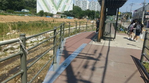 하천에 접한 좁은 도로에 버스 승강장까지 설치하다보니 여유 공간이 거의 없었기 때문이다.