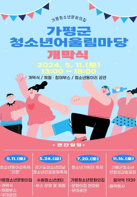 (중부시사신문) 가평군은 경기도와 가평군이 주최하고 가평청소년문화의집이 주관하는‘2024년 가평군청소년어울림마당 개막식’을 오는 11일 오후 1시부터 가평청소년문화의집에서 개최한다고 밝혔다.