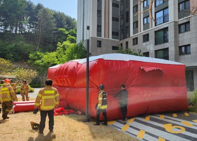 이번 훈련은 대상물 현지확인 및 실질적인 훈련을 통해 현장대원들의 대응 역량을 강화하고, 관계인 합동훈련을 통하여 자위소방대 역할 분담 및 인명구조용 에어매트 전개 능력 향상을 위하여 추진됐다.