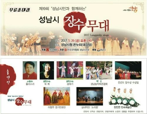 성남시 장수무대는 성남예총 주최, 한국국악협회 성남시지부(지부장 부명희)주관, 성남시가 후원하며, 폴리스리 사회로 관내 어르신들이 직접 참여하는 장기자랑 경연대회와, 성남농악보존협회의 판굿, 초청 가수 옥희, 삼태기, 이향우 경기민요단, 소리향 실내악단, 전년도 대상팀(장수상)의 축하공연 등이 펼쳐진다.