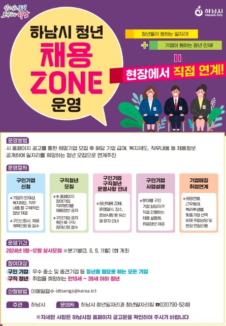 하남시는 ‘2024년 제2회 하남시 청년 채용 존(ZONE)’에 참가할 우수 기업의 참여를 독려하기 위해 하남시 홈페이지에 5월 1일부터 5월 31일까지 공고문을 게재했다.