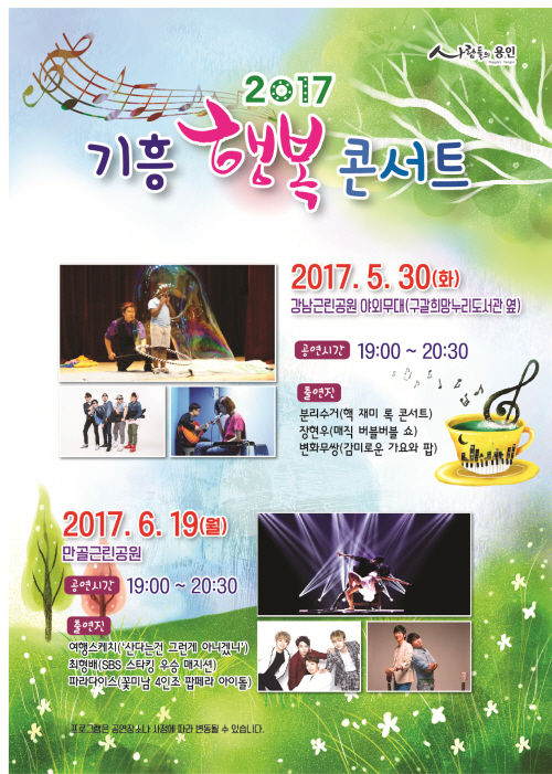 용인시 기흥구는 오는 30일 저녁 7시 구갈동 강남근린공원에서 ‘기흥행복콘서트’를 개최한다고 밝혔다.