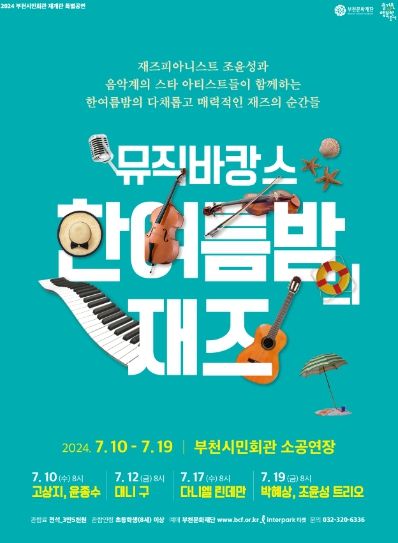 부천문화재단은 부천시민회관 소공연장에서 7월 10일부터 7월 19일까지 2주동안 수, 금요일 재즈콘서트 뮤직바캉스 '한여름밤의 재즈'를 선보인다.