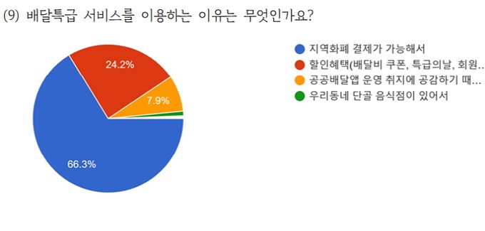 먼저 배달특급 서비스를 이용하는 이유와 관련해선 전체 응답자 중 66.3%가 ‘지역화폐 결제 가능’을 꼽아 가장 많은 응답을 차지했다. 그 뒤를 ‘할인혜택 때문에’(24.2%), ‘공공배달앱 운영 취지에 공감하기 때문’(7.9%) 등으로 조사됐다.