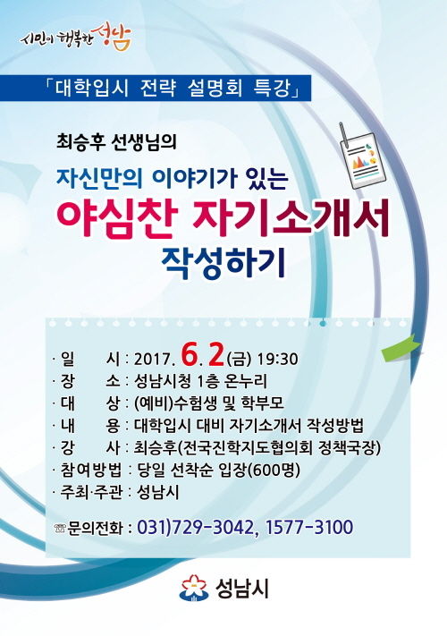 고혜경 성남시 교육청소년과장은 “구슬이 서 말이라도 꿰어야 보배라는 말이 있듯이 아무리 많은 활동과 경험을 쌓더라도 이를 자기소개서에 제대로 표현하지 못한다면 그동안의 노력이 빛을 발할 수 없다” 면서 “학생들의 가려운 곳을 시원하게 긁어주는 현장감 넘치는 강의가 될 것”이라고 말했다.