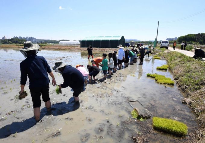 (중부시사신문) 화창한 봄 햇살로 더욱 반짝이는 드넓은 곡창지대, 호조벌에 1년 벼농사의 핵심인 모내기 작업이 본격적으로 시작됐다.