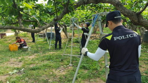 6. 1 안성경찰서 112타격대원 의경 10여명은 가뭄으로 시름에 빠지고 일손이 부족한 배 과수원을 찾아가 뜻 깊은 봉사활동을 하였다.