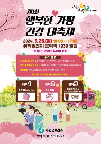 가평군보건소는 오는 26일 뮤직빌리지 음악역 1939 야외행사장에서 ‘제1회 행복한 가평, 건강대축제’를 개최한다고 21일 밝혔다.