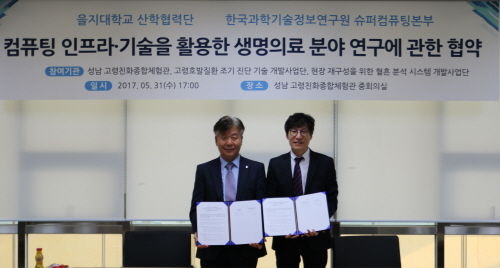 지난 31일 을지대학교 산학협력단(단장 김규호)과 한국과학기술정보연구원 슈퍼컴퓨팅본부(본부장 이필우, 이하 KISTI)가 성남 고령친화종합체험관에서 컴퓨팅 인프라·기술을 활용한 생명의료 분야 연구에 관한 협약을 체결했다.