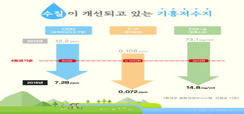 녹조 발생의 주범인 물속 인(비료성분 중 하나)이 얼마나 되는지를 나타내는 지표인 T-P(총인) 농도도 2014년엔 0.108ppm이었던 것이 2015년 0.053ppm, 2016년 0.072ppm 등으로 4등급 기준치(0.1ppm) 이내로 들어와 2년전보다 약 30% 나아졌다.