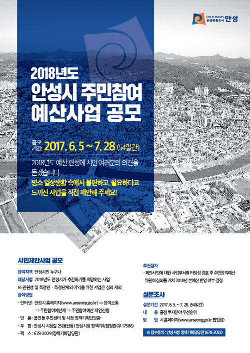 안성시는 2018년도 예산 편성을 위한 주민참여예산사업 공모 및 설문조사를 7월 28일까지 약 2개월간 실시한다고 밝혔다.