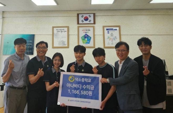 이번 기부금은 덕소중학교 학생들이 지난 10일 교내에서 진행한 아나바다 장터에서 학용품, 의류, 생활용품, 스포츠용품 등 사용하지 않는 물건을 판매한 수익금으로 마련했다.