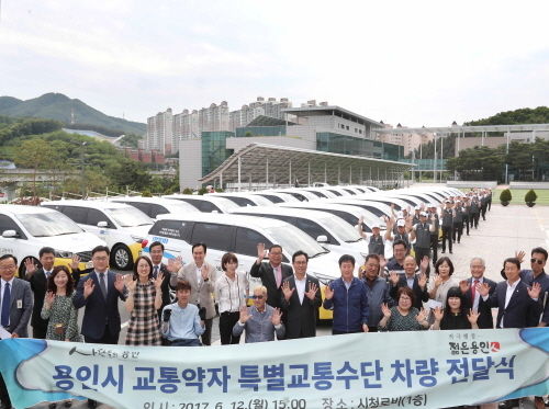 용인시는 12일 오후 시청 하늘광장에서 장애인 등 교통약자가 이용할 수 있는 특별교통수단 차량 24대를 도입해 교통약자 이동지원센터에 전달했다고 밝혔다.