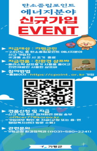 은 군민들의 일상 속 탄소중립 실천문화를 확산시키고 탄소중립포인트제 운영 활성화를 위해 ‘탄소중립포인트제 에너지분야’ 신규가입 이벤트를 진행한다고 31일 밝혔다.
