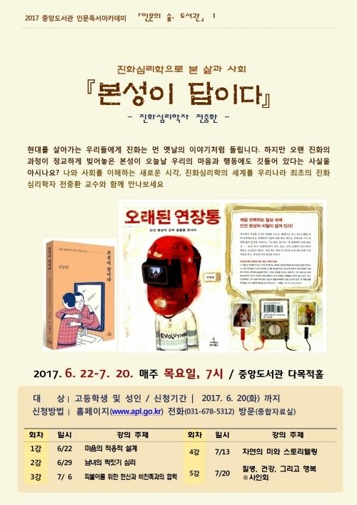 안성시립중앙도서관이 오는 6월 22일 목요일 저녁 7시, 우리나라 최초의 진화심리학자 전중환 교수의 <본성이 답이다>로 2017 인문독서아카데미(야간 인문학 강연)의 문을 연다.