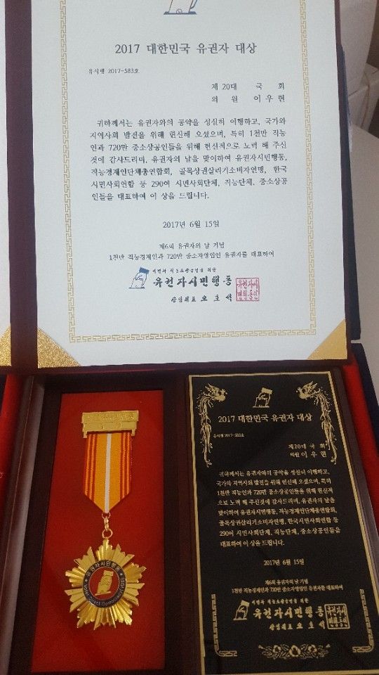 ‘대한민국 유권자 대상’은 직능ㆍ소상공인, 골목상권ㆍ자영업 등 260여 단체가 공동 출범한 ‘유권자시민행동’에서 공약 이행 및 골목상권 살리기, 직능인과 중소상공인에 대한 우수 정책을 추진한 선출직 공직자를 선정해 주는 상이다.