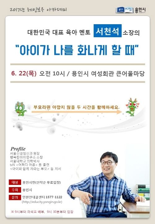 용인시는 시민을 위한 교양강좌인 ‘레인보우아카데미’의 올해 네 번째 특강으로 오는 22일 여성회관 큰어울마당에서 육아전문가인 행복한아이연구소 서천석 소장이 강연을 한다고 밝혔다.