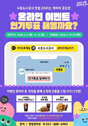온라인 인기 투표 이벤트는 출품작 전체를 대상으로 하며, 공사에 관심 있는 누구나 카카오톡에서 ‘시흥도시공사’ 채널을 친구 추가하면 참여할 수 있다. 이벤트는 캐릭터 공모전 본 심사와는 별개로 진행되며, 득표수에 따라 상위 2건을 선정해 인기상을 수여하고 시상금 각 5만 원은 지역경제 활성화를 위해 지역화폐(시루)로 지급할 계획이다. 투표 참여자 중 무작위 추첨을 통해 15명에게는 소정의 경품을 제공한다.