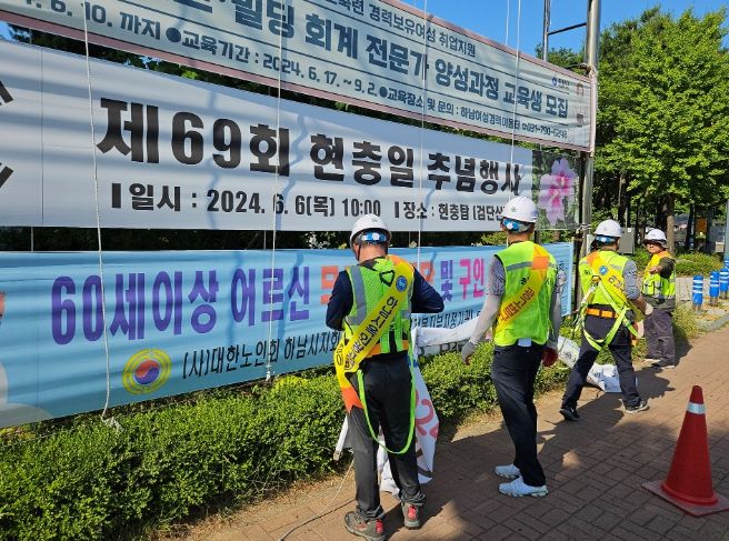 5일 하남시에 따르면 시는 지난 4일 옥외광고물 민간위탁 단체인 하남시 옥외광고협회와 함께 현수막 지정 게시대의 로프 노후도와 지지구조물의 변형 여부, 볼트 용접 접합부 확인 등 옥외광고물의 위험 요소를 전반적으로 점검했다.