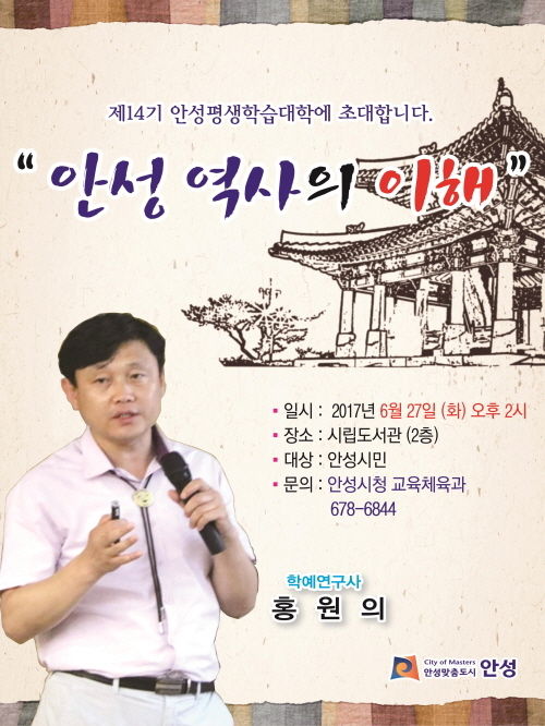 안성시(시장 황은성)는 오는 6월 27일(화)요일 오후 2시 안성시립(중앙)도서관에서 안성평생학습대학 4회차 강연으로 안성시청 학예연구사로 재직하고 있는 홍원의 박사를 초정하여‘안성 역사의 이해’라는 주제로 시민들에게 역사특강을 펼칠 예정이다.