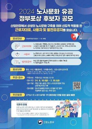 (중부시사신문) 고용노동부는'2024년도 노사문화유공 정부포상」 계획을 공고하고, 6.10.(월)부터 7.19.(금)까지 포상후보자 추천서를 접수한다고 밝혔다.