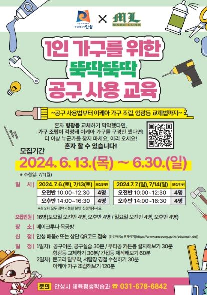 1인 가구라면 한번쯤 제대로 배워보고 싶었을 재밌고 유익한 공구 사용교육은 6월 13일(목)부터 30일(일)까지 안성 배움e 홈페이지에서 참여자를 모집하며, 7월 1일(월)에 추첨을 진행한다.