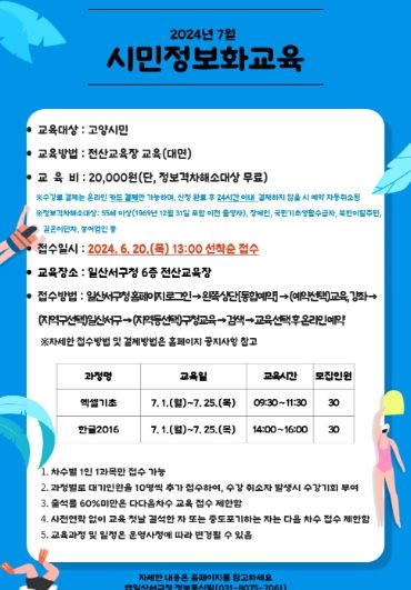 5차 시민정보화교육은 7월 1일부터 7월 25일까지 16일간 오전 9시 30부터 11시 30분까지, 오후 2시부터 4시까지 총 두 차례, 일산서구청 6층 전산교육장에서 진행된다.