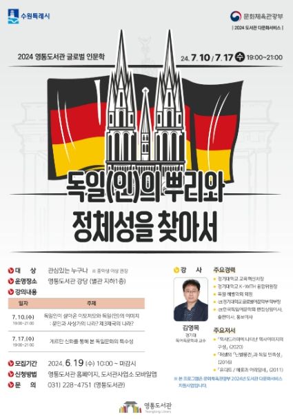(중부시사신문) 수원 영통도서관이 2024 글로벌 인문학 강의(1·2회차)인 ‘독일(인)의 뿌리와 정체성을 찾아서’의 수강생을 모집한다.