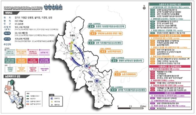 총사업비는 2025년부터 5년간 국비 220억원을 포함해 321억원으로 계획하고 있다. 주요 제출 사업은 청평면 중심지활성화사업(160억원), 설악면 기초생활거점조성사업(60억원), 상면 기초생활거점조성사업(60억원), 조종면 기초생활거점조성사업 2단계(20억원) 등이 있다.