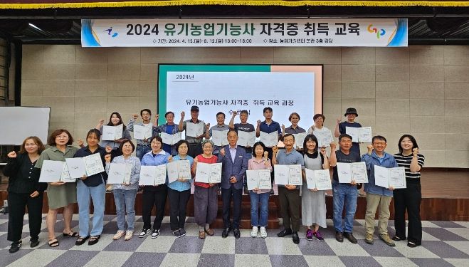 (중부시사신문) 가평군농업기술센터는 최근 교육 수료생 23명과 함께 ‘2024년 유기농업기능사 국가기술자격증 취득 과정’ 수료식을 개최했다.