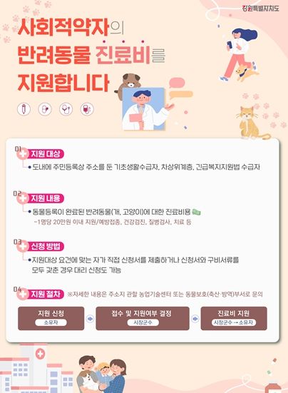 (중부시사신문) 강원특별자치도는 사회적약자가 반려동물과 함께 건강한 삶을 살 수 있도록 ‘사회적약자의 반려동물 진료비 지원 사업’을 추진한다고 밝혔다.