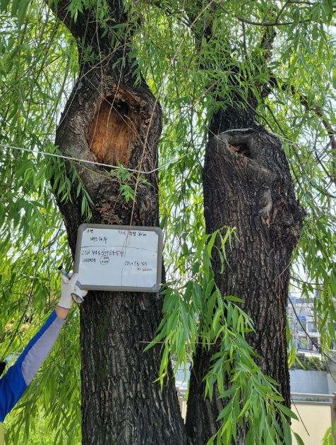 지난 5~6월 반달로·서부로·수원천로·권중로 등 5개 구간의 대형 가로수 500주를 대상으로 병해충 피해 여부, 수목 상태 등을 육안으로 진단한 후 166주는 정밀 안전진단을 했다. 부호(腐朽) 진행 상태, 공동(空洞) 발생 위험 등을 진단하고, 나무 청진기를 이용해 수목활력도(형성층)를 측정했다.