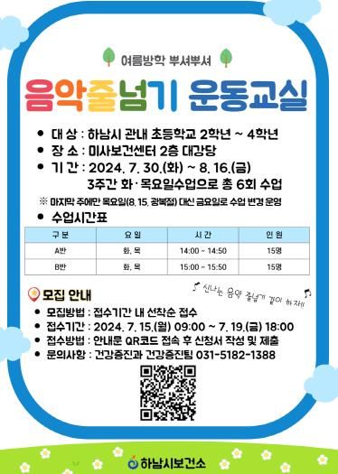 (중부시사신문) 하남시는 ‘여름방학 음악줄넘기 운동교실’ 프로그램에 참가할 지역 내 초등학교 2~4학년 학생 30명을 오는 15일부터 모집한다.