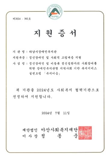 (중부시사신문) 하남시장애인복지관이 2024년 아산사회복지재단 정신장애인 및 사회적 고립계층 지원사업 협력기관으로 선정됐다.