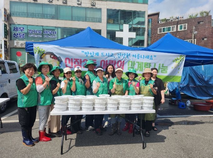 사랑의 삼계탕 나눔행사에 참석한 새마을부녀회원 20여명은 정성스레 준비한 삼계탕과 여름김치를 관내 신정경로당 어르신과 독거노인 60명에게 전달했다.