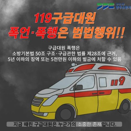 강덕원 소방서장은 “구급대원에 대한 폭행은 다른 위급한 환자의 생명을 위험하게 만드는 행위”라며 “구급대원도 누군가의 소중한 가족이며, 구급대원에게 폭언·폭행이 아닌 응원과 격려를 부탁드린다.”라고 전했다.