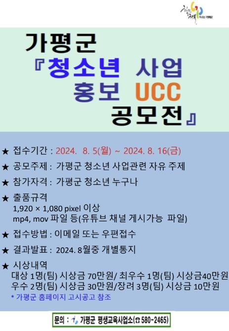 (중부시사신문) 가평군이 군의 다양한 청소년 사업을 널리 알리고 참여 기회를 확대하고자 ‘가평군 청소년 사업 홍보 UCC(사용자가 직접 제작한 콘텐츠) 공모전’을 개최한다.