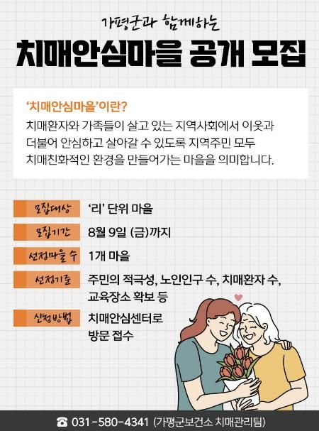 (중부시사신문) 가평군보건소 치매안심센터가 오는 8월 9일까지 ‘치매안심마을’을 공개 모집한다.