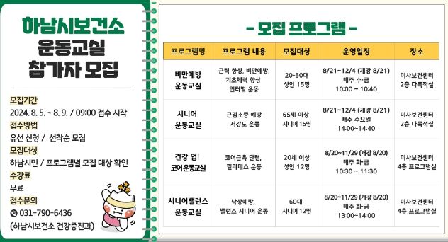 하남시보건소 운동교실 참가 희망자는 모집 안내문을 참고해 오는 5일부터 9일까지 하남시 건강증진과 건강증진팀에 전화로 신청하면 된다.