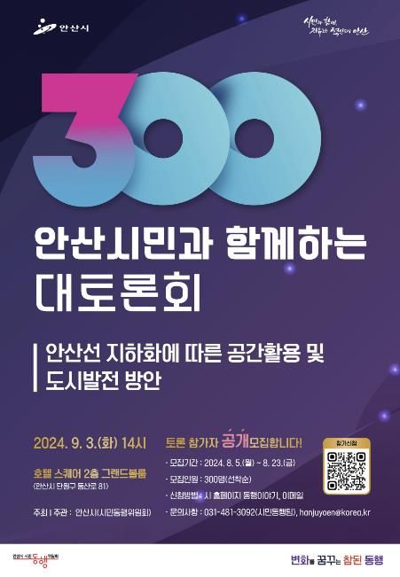 이번 대토론회는 안산시민 누구나 참여 가능하며, 300명 선착순 신청을 받는다. 참가 신청은 오는 23일까지 홍보자료의 QR코드를 이용, 안산시 누리집(홈페이지) ‘동행이야기’에 접속하거나 새소식의 신청서를 내려받아 작성 후 이메일로 제출하면 된다. 자세한 사항은 안산시청 시민협력관으로 문의하면 된다.