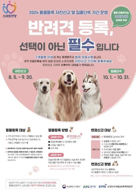 최대호 안양시장은 “동물등록은 반려동물과 함께하는 행복한 도시 조성의 첫걸음”이라며 “책임감 있는 반려동물 문화 조성을 위해 반려인들이 동물등록에 적극 참여해주시고, 미처 신고하지 못한 반려동물은 이번 자진신고 기간 내 신고해달라”고 말했다.