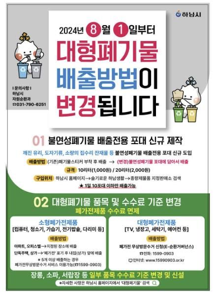 아울러 하남시는 불에 타지 않는 가정용 불연성폐기물을 포대에 담아 편리하게 배출(1일 최대 10포대 이하로 제한)할 수 있도록 ‘불연성폐기물 포대’를 새롭게 제작·보급했다.