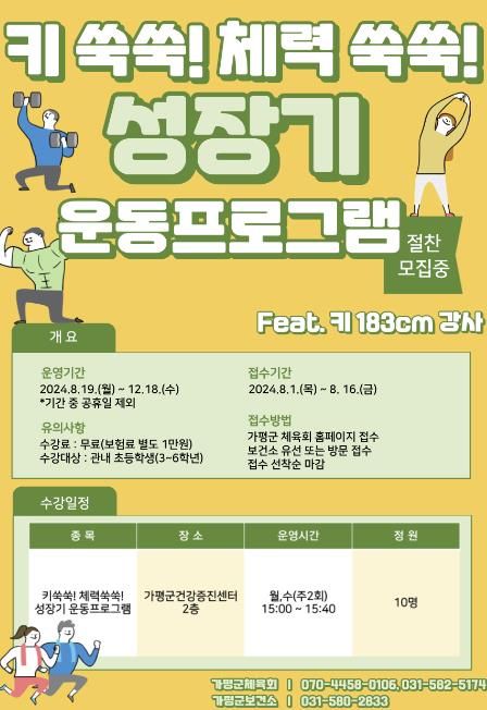 (중부시사신문) 가평군보건소와 가평군체육회가 협업해 성장기 아동들을 위한 ‘키 쑥쑥! 체력 쑥쑥! 운동 프로그램’을 운영한다.