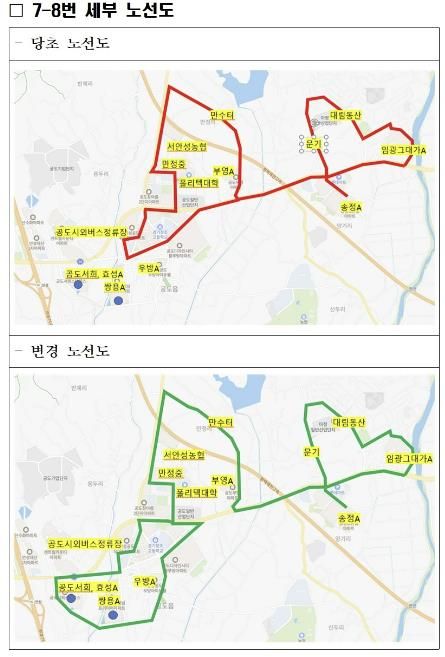 한편, 7-8번 버스는 공도읍 임광그대가 아파트에서 출발하여 서안성농협, 폴리텍대학 등 공도를 순환하는 노선이며, 7-8번 시내 버스의 자세한 운행시간표는 안성시 홈페이지를 참고하면 된다.