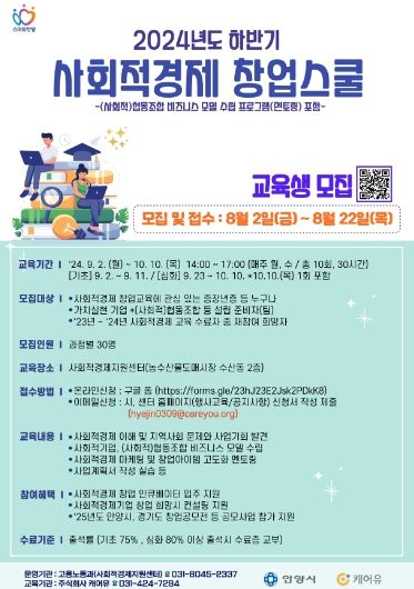 (중부시사신문) 안양시가 오는 9월부터 10월까지 ‘하반기 사회적경제 창업스쿨’을 운영하고, 교육생을 이달 22일까지 모집 중이라고 7일 밝혔다.