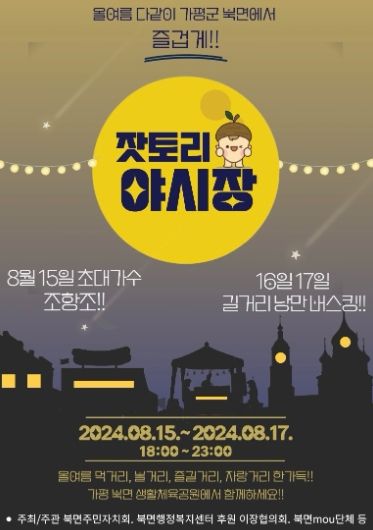 이번 축제는 북면생활체육공원에서 15일부터 17일까지 오후 6시부터 열리는 데 먹거리 판매 부스, 바자회, 버스킹, 체험 프로그램, 휴게·놀이존 등으로 구성된다.