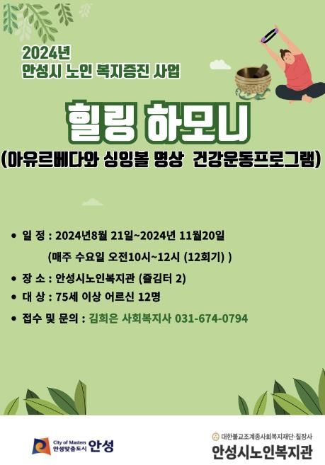 (중부시사신문) 안성시노인복지관은 2024년 안성시 노인복지증진 공모 사업에 선정되어 아유르베다와 싱잉볼 명상을 통한 노년기 삶의 질 향상 건강 프로그램 “힐링 하모니”를 진행한다고 밝혔다.