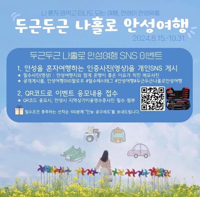 '두근두근 나홀로 안성여행' SNS이벤트 참여방법은 안성을 혼자 여행하는 인증사진이나 영상을 개인SNS 에 인증 후 QR코드로 응모하면 된다. (QR코드 응모 시, 여행 동안 안성지역 상가를 이용한 영수증 첨부) 특히나, SNS에 게시하는 여행 사진(영상)에는 혼자하는 여행이 좋은 이유를 적은 메모로, 참여자들의 기발한 혼행이 좋은 이유들이 사람들에게 혼행의 매력공감을 얻을 수 있을 것으로 기대된다. 이벤트 필수조건을 완수한 참가자에게는 1인 가구를 위한 만능공구세트를 기념품으로 발송한다.